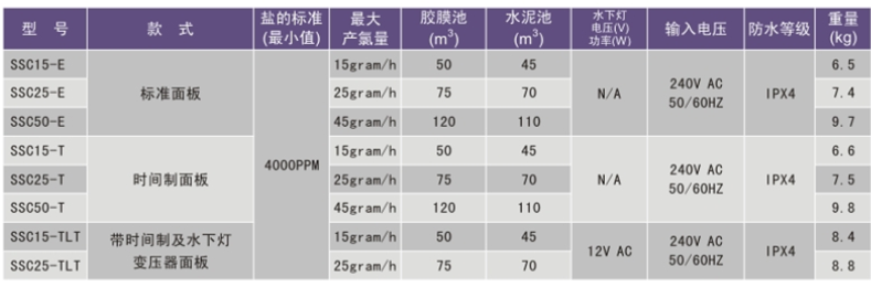 三種款式選擇;產(chǎn)氯量15g、小時(shí)、25g/小時(shí)、45g/小時(shí).