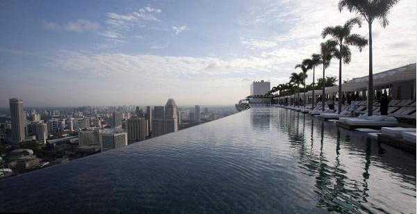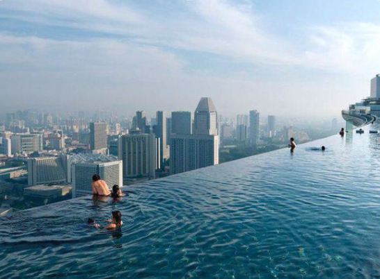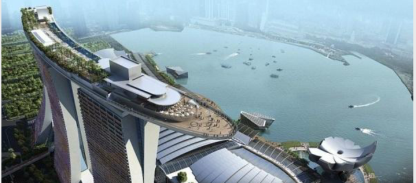 新加坡濱海金沙酒店塔樓的空中花園以及巨大的游泳池。據(jù)設(shè)計(jì)師莫舍?薩夫迪介紹說,三座塔樓是根據(jù)一副牌的形狀來設(shè)計(jì)的。