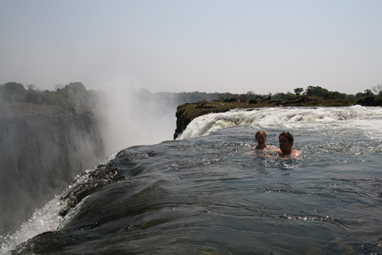 位于非洲東南部的維多利亞瀑布是世界上最大的瀑布,它有尼亞加拉大瀑布的兩倍高。盡管它的高度令人畏懼,但勇敢的人卻在瀑布頂端發現了一個天然泳池。在一年中的9月到12月是泳池水位最低的時候,游泳愛好者進入到魔鬼泳池水流最緩慢的區域盡情享受泉水的涼爽,瀑布從那里傾瀉到355英尺下的大峽谷中,可謂是驚險刺激。