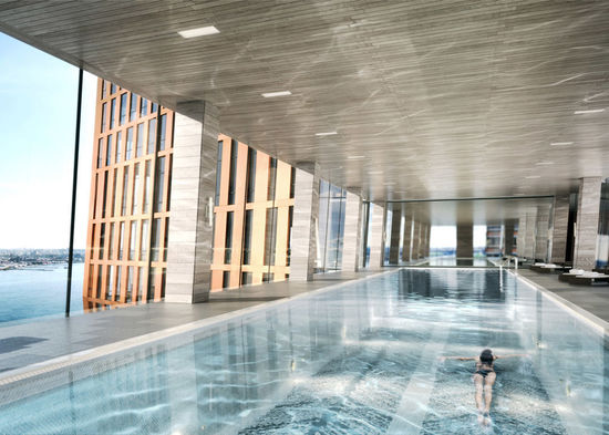 建筑將包括近 800 個(gè)套間,可用作工作室或者套間的公寓。三層天橋里有一個(gè) 75 英尺 (23 米) 長(zhǎng)的游泳池、熱水浴池、酒吧和會(huì)客廳,相當(dāng)于是整體住宅的交流中心。橋本身是封閉的,兩邊安裝了玻璃幕墻,可以眺望對(duì)面 East River 的景色和曼哈頓建筑群。身處在其中恐怕會(huì)忘記這是一架懸空的橋梁,但看風(fēng)景的絕好視線想必會(huì)增加游泳或鍛煉的動(dòng)力吧。